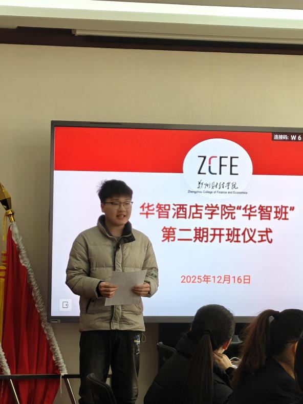 最后,第二期“华智班”学员代表桑卓洋发言,他表达了对学校和企业的感谢,并代表全体学员郑重承诺以饱满的热情投入学习与实践,努力掌握酒店管理的专业知识与实操技能,不负校企双方的共同培养与期待。